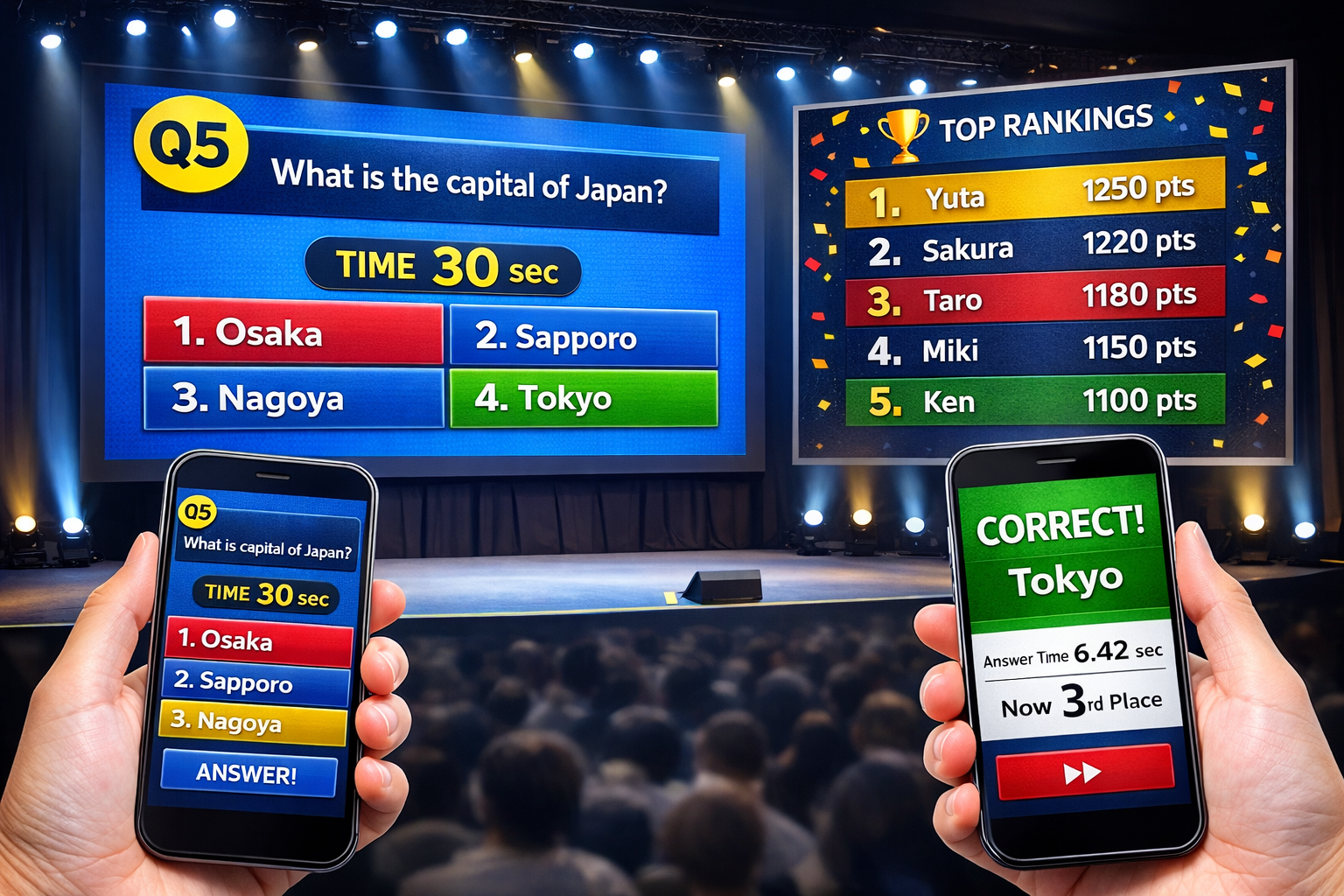 一般常識問題、謎解き、会社の製品や従業員に関するオリジナルクイズその場の何かにチャレンジし、その結果を予測する予測クイズなど様々な角度のクイズを出題。正解数と回答速度を瞬時に計測し順位発表!