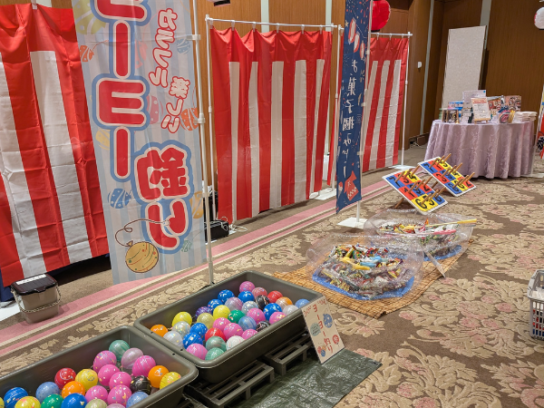 当日は約120名様の社員様がお集りになった盛大なパーティーとなりました。普段はフォーマルな印象のホテル空間を、射的・輪投げ・お菓子つかみ・ヨーヨー釣りといった縁日ブースで彩り、賑やかで温かみのある雰囲気を演出することが出来たかと思います!