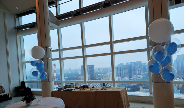 ステージと反対の、高層階からの景色を望める位置にビュッフェ台を設置。立食スタイルでゲスト同士が自然にこうリュを楽しめるような雰囲気となりました。