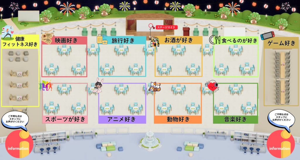 ▶謎解き後は、トークテーマごとにエリアを分けたフリートークタイム!