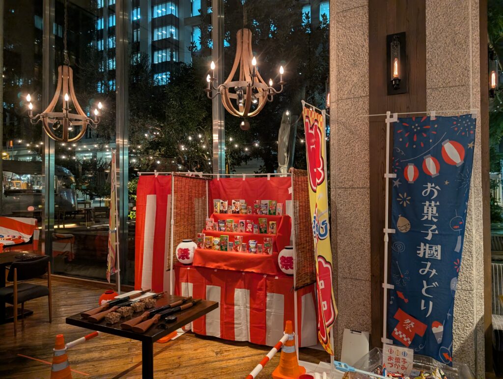 洗練された空間の中に縁日ブースを設置することで、通常のパーティーとは異なる雰囲気を演出しつつ、誰でも楽しみながら参加できるイベント空間になりました。